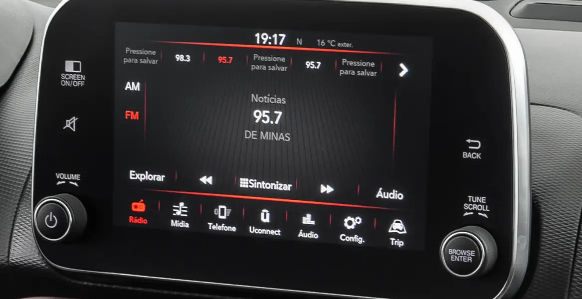 Central Multimídia UCONNECT de 7" Touchscreen com Android Auto e Apple Car Play, Bluetooth, entradas USB (2) e Sistema de reconhecimento de voz; Segunda porta USB